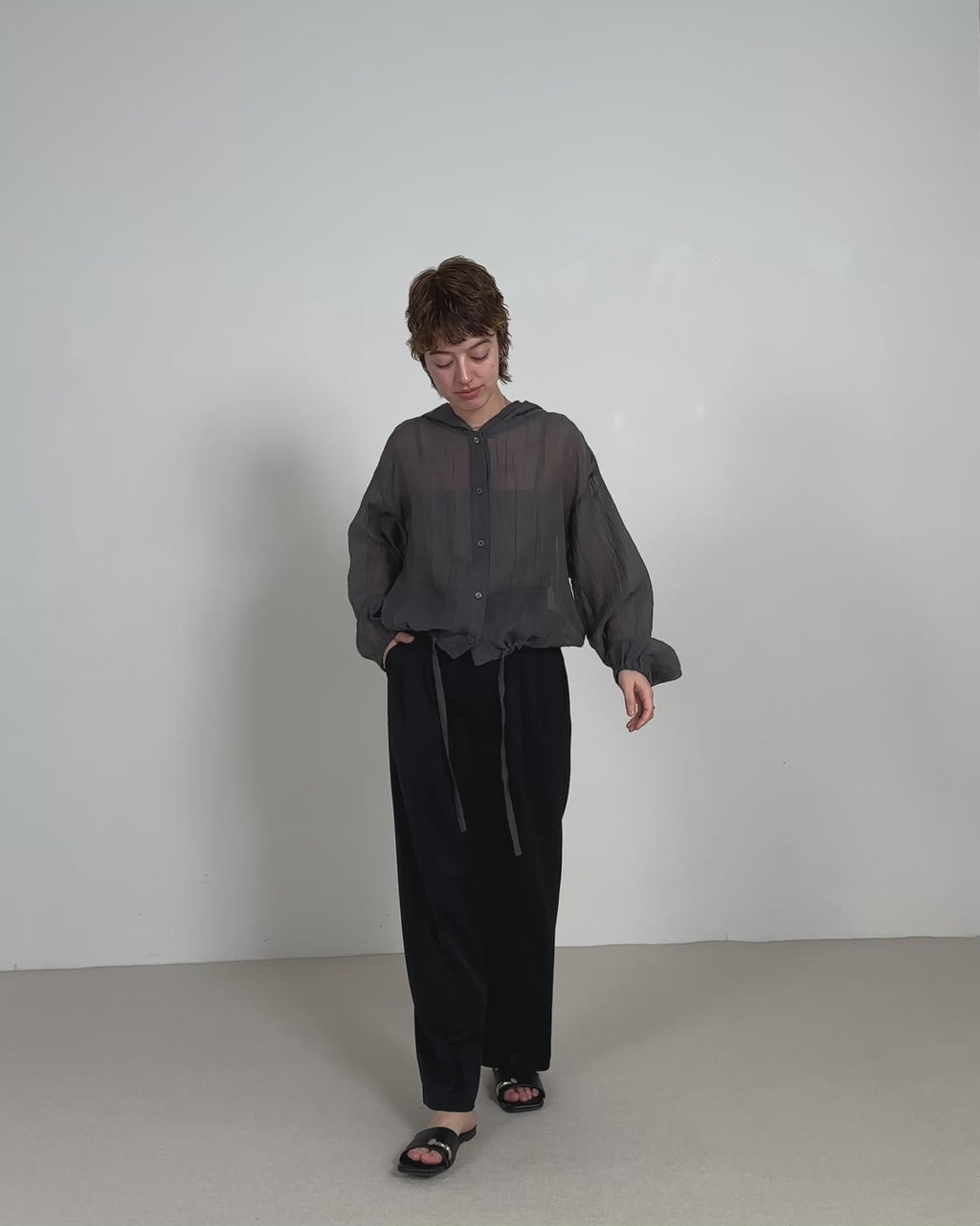 フード付き楊柳ドロストブラウス