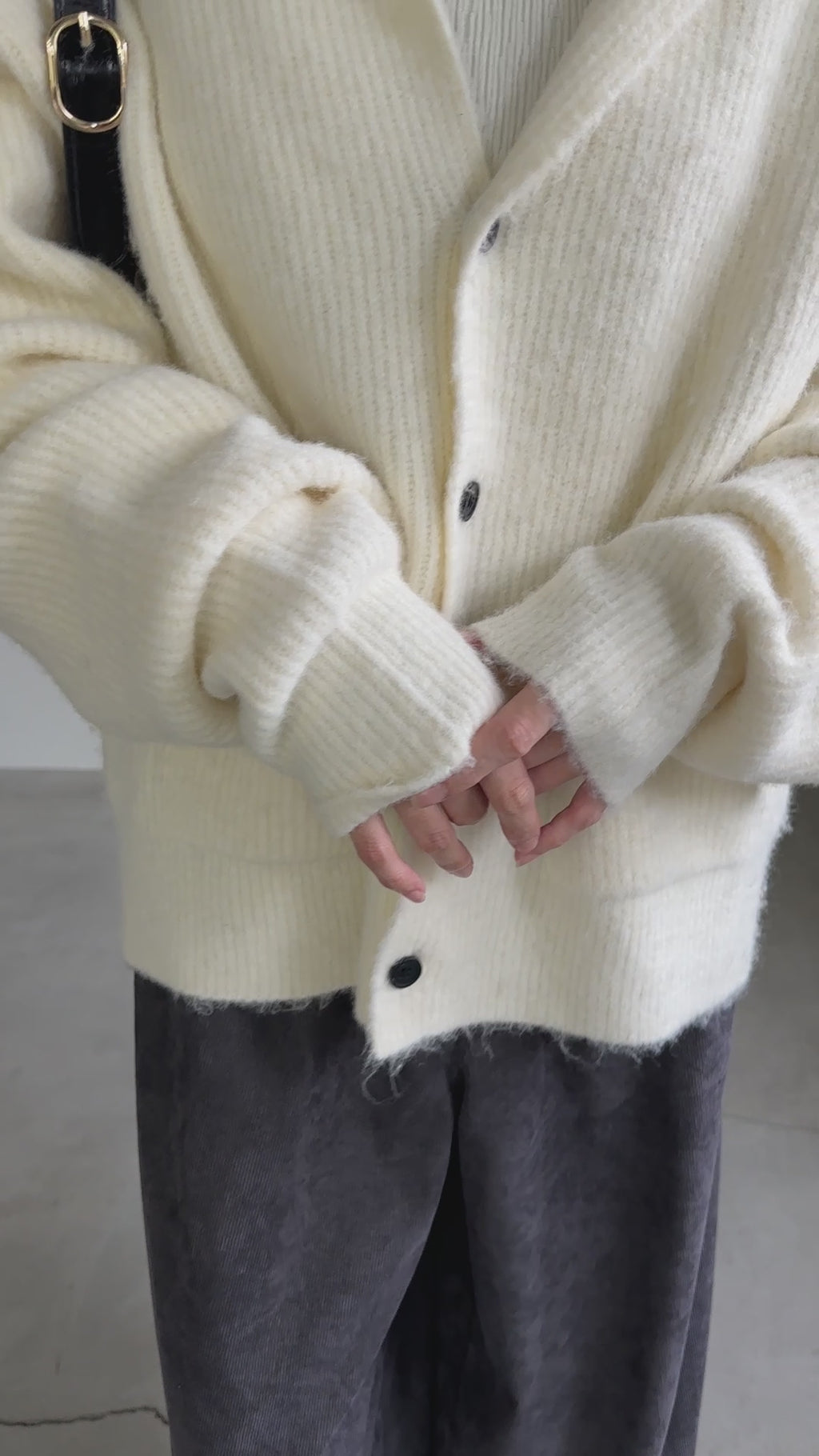 大きめのフーディーと深めのVネックデザインが抜け感を演出するニットカーディガン。