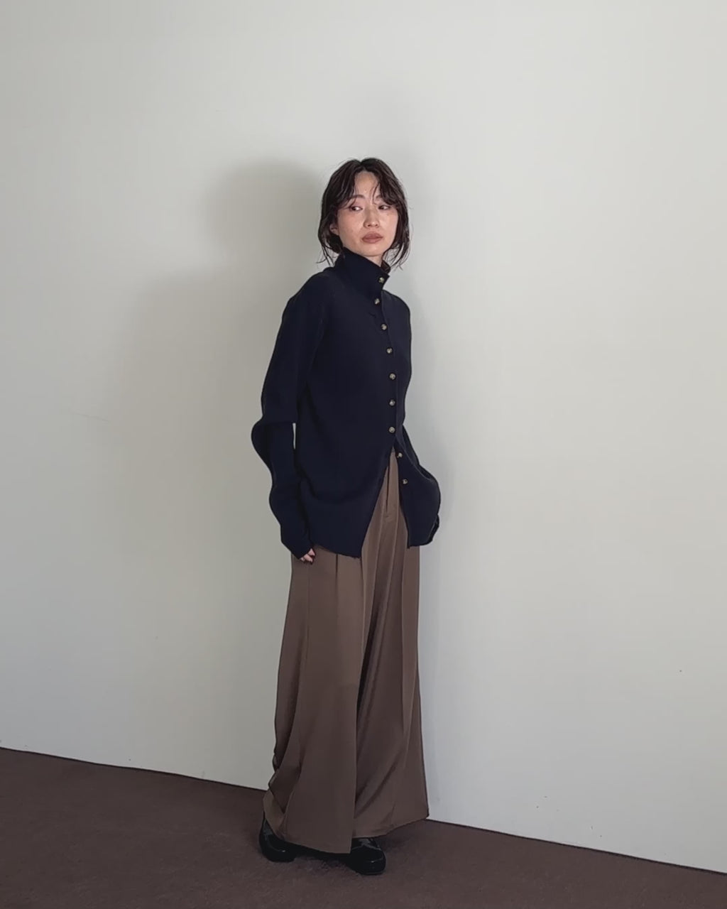 【Et】Button Design High-Neck Rib Knit Cardigan