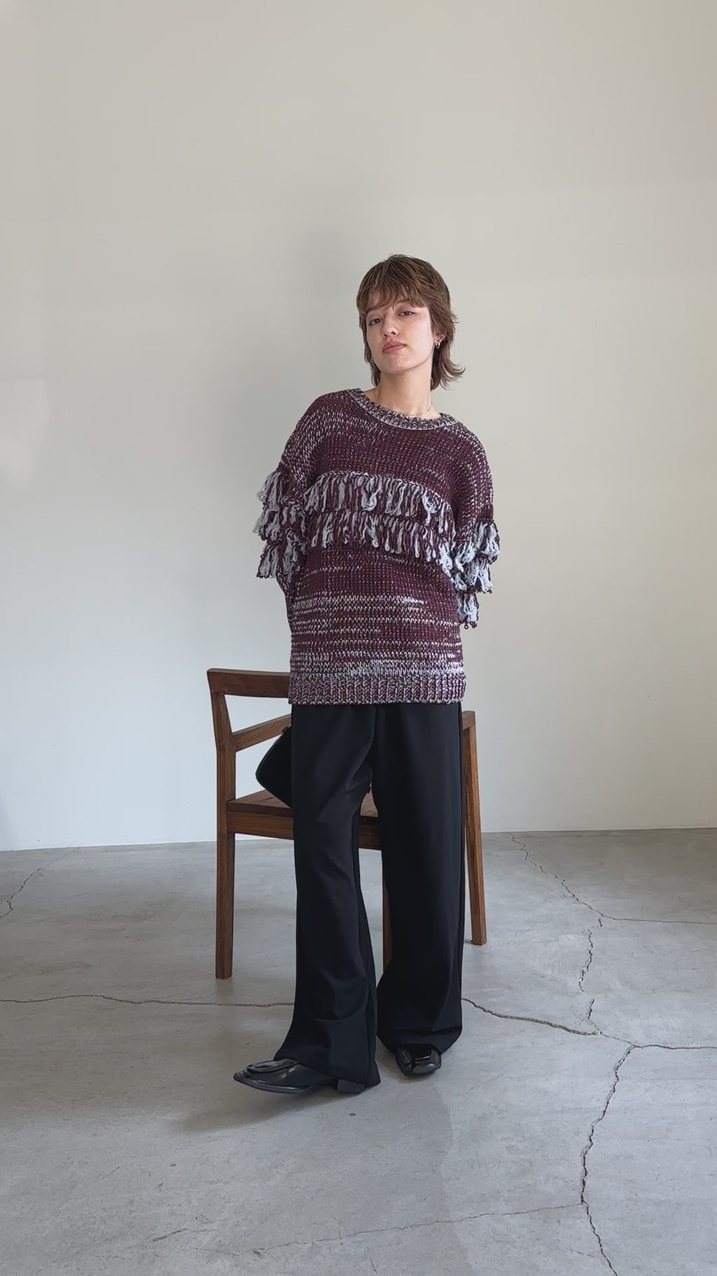 クルーネックミックスフリンジニットトップス