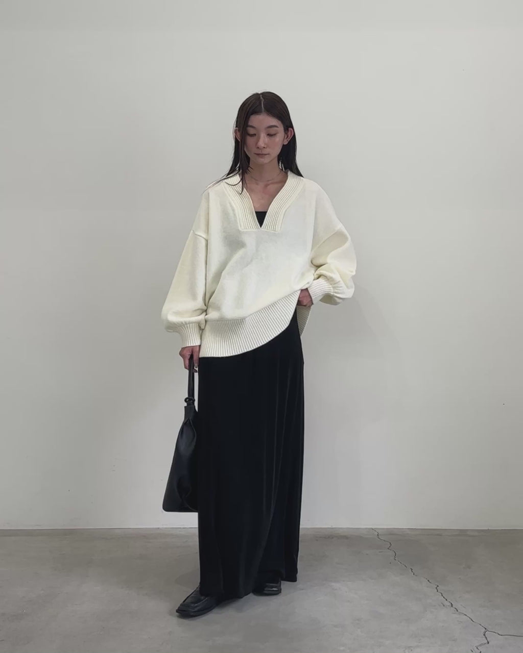 胸元のVネックに丸みをつけて上品な印象に仕上げた1枚。