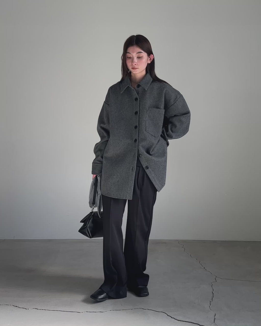 秋冬らしいウールライクな素材感で、ボディラインを拾わずバサッと羽織って着映えるシルエットに仕上げています。